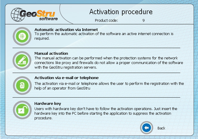 The manual activation can be performed when the protection systems for the network connections like proxy and firewalls do not allow a proper communication of the software with the GeoStru registration servers.