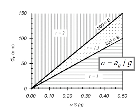 dove ag è l'intensità sismica del sito, S il coefficiente d'amplificazione funzione della stratigrafia locale ed r un parametro che permette di scalare l'intensità dell'azione sismica nel calcolo delle azioni di progetto della struttura. Il coefficiente r può assumere valori compresi tra 1 e 2, a seconda della tipologia dell'opera in relazione al comportamento durante il sisma ed al danno permanente tollerabile.