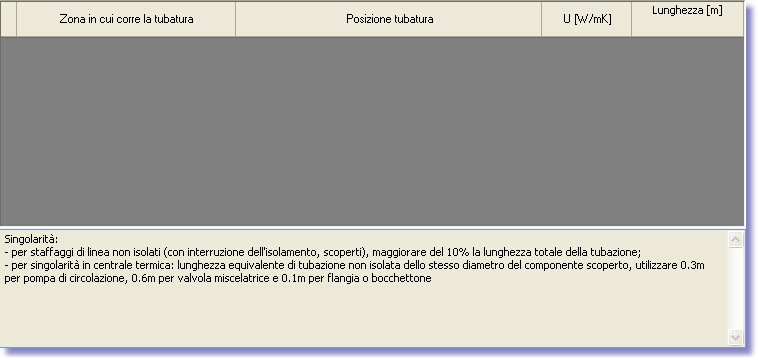 Cliccando con il tasto sinistro del mouse sul rigo della tabella si possono modificare direttamente le caselle 'Descrizione', 'U [W/mK] e 'Lunghezza', digitando i valori da inserire, ma NON SI PUO' TORNARE alle finestre 'Tubazione UNI TS 11300-2' e 'Tubazione 412/93'.