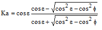 In effetti Rankine adottò essenzialmente le stesse ipotesi fatte da Coulomb, ad eccezione del fatto che trascurò l’attrito terra-muro e la presenza di coesione. Nella sua formulazione generale l’espressione di Ka di Rankine si presenta come segue: