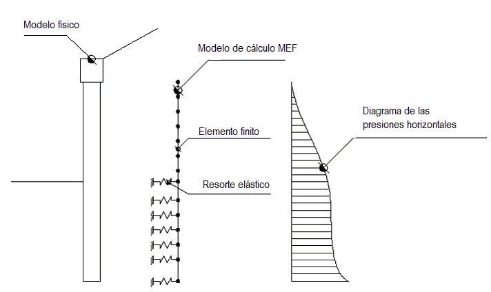 Con el MEF la pantalla se modela como un conjunto de vigas (elementos beam), vinculadas en continuidad al terreno por medio de resortes elásticos cuyas rigidez se estima en función de las propiedades elásticas del terreno. En la siguiente figura se muestra el esquema del modelo utilizado para el análisis con elementos finitos: