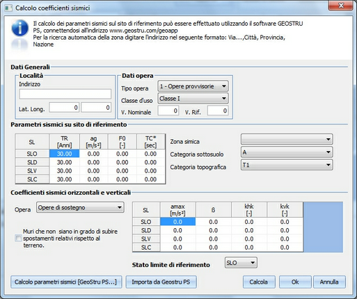 Cliccando sul pulsante ''Calcolo parametri sismici [GeoStru PS...]'' l'utente ha la possibilità di collegarsi direttamente al software on line GeoStru PS (www.geostru.com/geoapp) e calcolare i parametri sismici del modello secondo le nuove norme tecniche per le costruzioni (NTC2008), inserendo tutti i dati previsti dalla stessa norma (Tipo opera, Classe d'uso, Tr, ag ecc.) direttamente sul web.