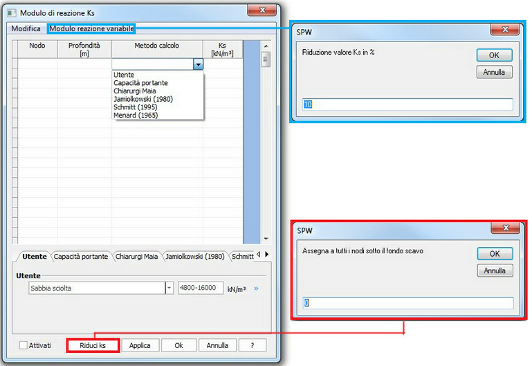 Attraverso il pulsante Riduci ks si attiva una finestra di dialogo in cui va inserito il valore percentuale di cui si intende ridurre il modulo di reazione. E' possibile inoltre assegnare in automatico un valore al modulo di reazione del terreno a tutti i nodi sotto il fondo scavo selezionare Modulo reazione variabile/Assegnare a tutti i nodi sotto il fondo scavo.